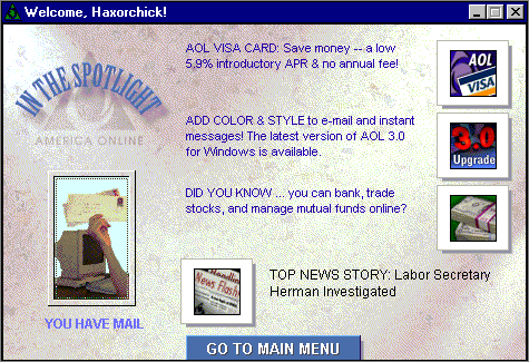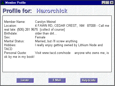 Ut Oh! Looks like Carolyn Meinel's America Online account just got hacked! It's the damndest thing, huh? Well, I guess it just goes to show that Lithium Node and TACD really do own her, huh? Oh, and just in case there are any doubts about the validity of this, Node was kind enough to include some screen shots! Have fun kiddies, and check out Node's website for more crazy AOL antics! |