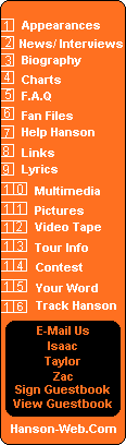 HansonWeb.Com was designed and built by Marjan Agicic. Marjan can be reached at hansonweb@hanson-web.com. All graphics other than Mercury Records images belong to Hanson-Web.Com. They may not be used without permission from owner. HansonWeb is best viewed with a 1024 by 768 pixels of exposure, and 256 colors or more is recommended. For advertising info please sent e-mail to sales@hanson-web.com. This site is best viewed with Microsoft Internet explorer 3.0x