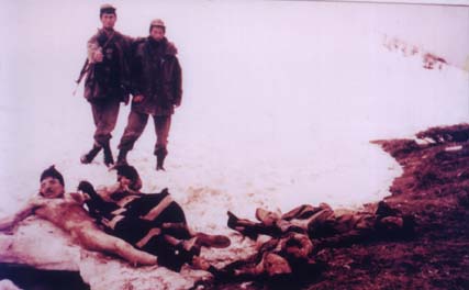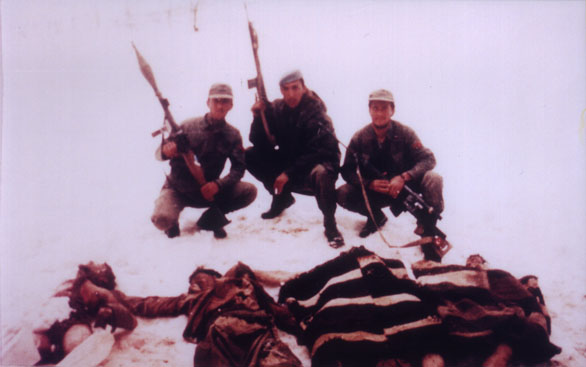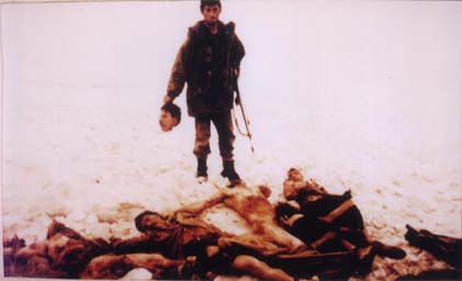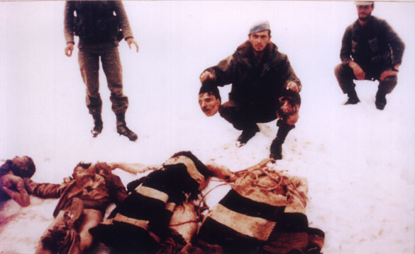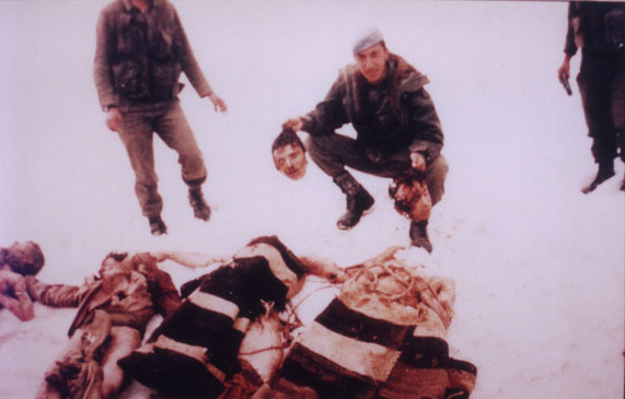 Kurd SufferageThe pictures published here are evidence of a savagery that took place in April 1995 in the district of Hakkari in the Kurdish regions of southeastern Turkey. The perpetrators of this act were Turkish soldiers, members of the Hakkari Mountain Brigadier Command, and the victims are four members of the People's Liberation Army of Kurdistan (ARGK). These photos were featured on the cover of the January 11-17 edition of the London weekly "The European". The savagery of the Turkish state is not limited to the Kurdish regions of Turkey, however. During its cross-border operation in northern Iraq in March and April of 1995, disregarding international outcry, members of the Turkish armed forces massacred seven shepherds in Dahok in the same manner. Do not misunderstand this message: This is not simply exterminating the Kurdish people, this is terminating humanity. Halt This Savagery!