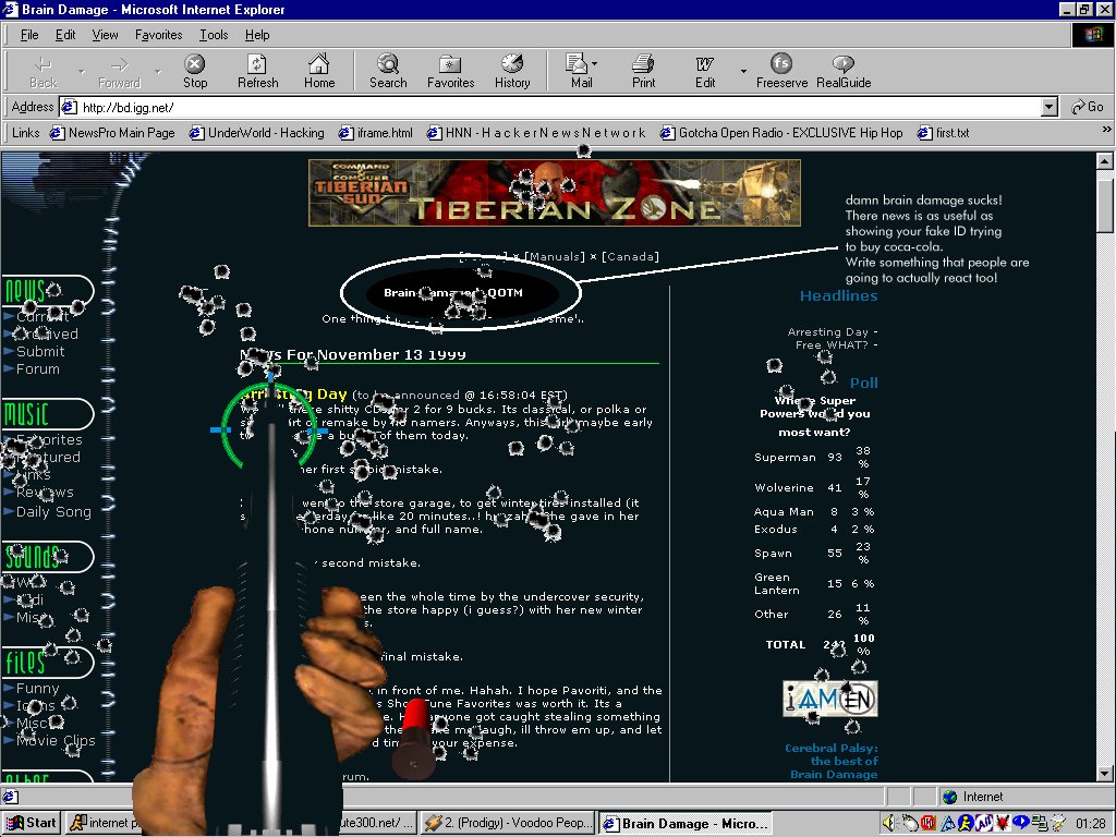 Once you click them you'll notice none of them even exist, but whos to say you need relevent and entertaining content to have a good site..........Brain Damage certainly doesn't, all you need is a well known name, a nice layout and a link by someone who is not smart enough to judge a site on what they think of what they read and judge it by who made it. If you can get those three things i can guarantee you'll have a what I call a LILH [a loser in lifes hideout] site. You'll be getting hits coming out of your ass, worked for Deft when Icecream linked him, why wouldnt it work for you?