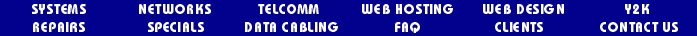 [ SYSTEMS | NETWORKS | TELECOM | WEB HOSTING | WEB DESIGN | DATA CABLING | REPAIRS | SPECIALS | Y2K | FAQ | CLIENTS | CONTACT US ] |