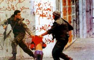An Israeli soldier with "Born to kill" written on the back of his helmet, aims his M-16 assault rifle at Palestinian stone-throwers during Israel's holocaust campaign December 4th in the West Bank town of Bethlehem.