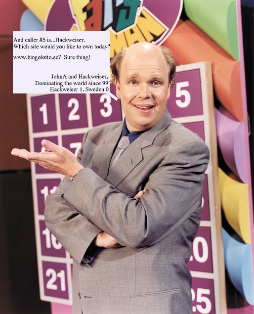 Recieving transmission... Objective: Global Domination Target: www.bingolotto.se Location: Sweden Message: Global Domination is upon the world, its name is Hackweiser, and you could be next. Have a nice day. ;-) -JohnA Hackweiser